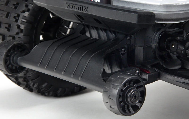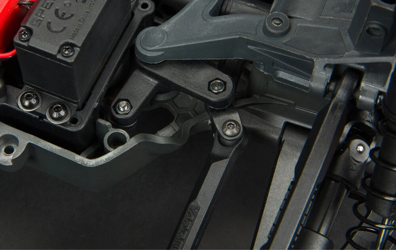 It has the ingenious modular design perfected by ARRMA® engineers for easy component access and maintenance. The power module, with improved dirt management, consists of the motor with ARRMA® heatsink and cooling fan, plus motor plate, slipper clutch assembly and gear cover. The power module can be detached from the chassis as a complete unit by removing just one screw. With the power module removed, the slipper clutch can be reached easily for adjustments by taking out three screws that attach the gear cover. The gear ratio can be finely tuned as the power module now uses a sliding motor mesh design.