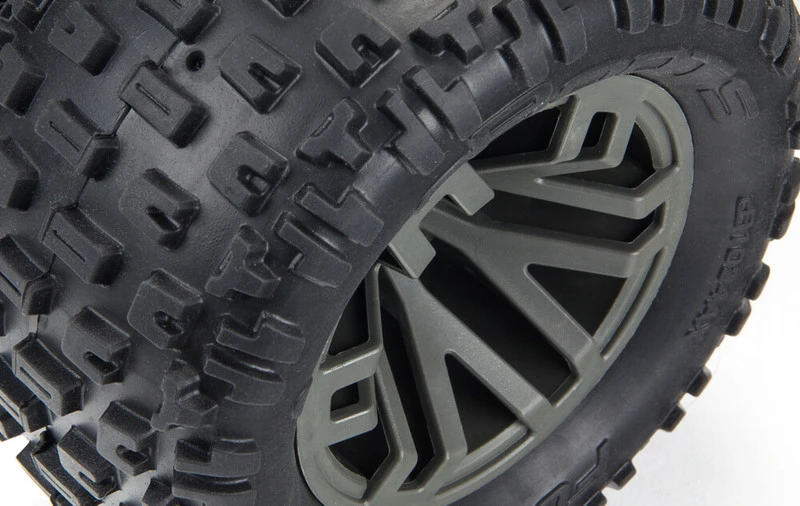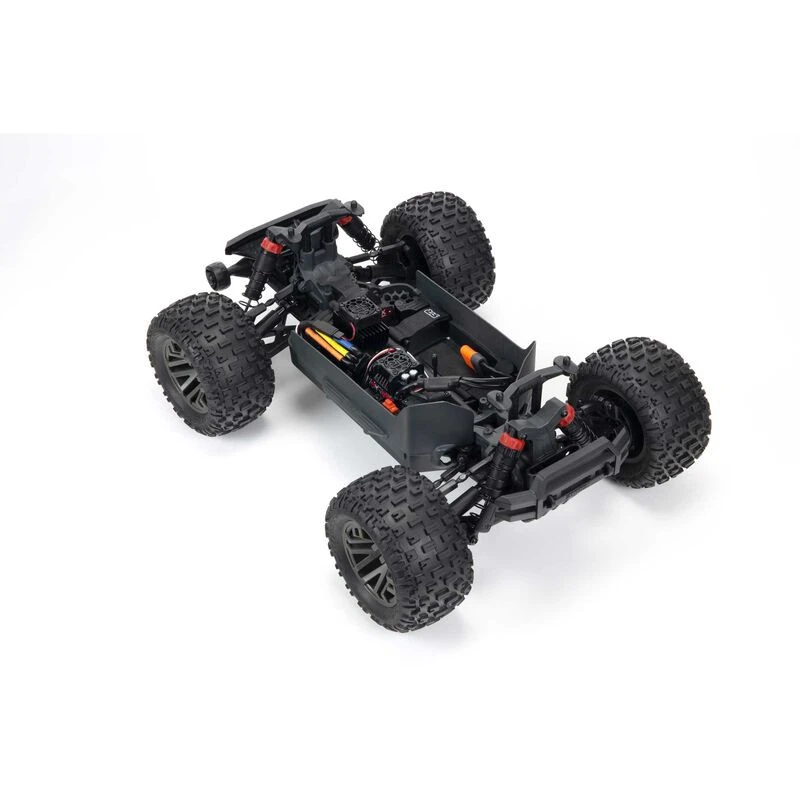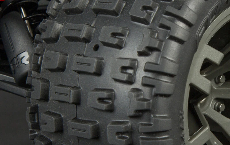 Four dBoots® Fortress™ MT tires on gunmetal multi-spoke wheels give the GRANITE™ 4X4 3S BLX superb bite on a multitude of surfaces. ARRMA® has also installed a wheelie bar as standard. The aggressively styled truck body looks great while bashing and even better up-close and personal, with great attention to detail on the decal and body aesthetics. Choose green or red trim schemes.