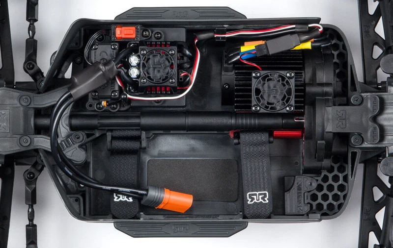 - Two-piece molding screwed to the chassis contains a waterproof receiver box, servo mount, and ESC tray.