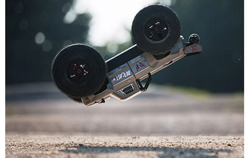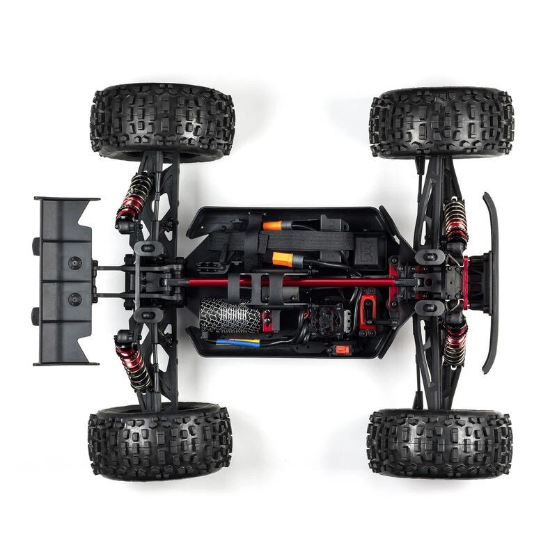 For the durability needed to support extreme stunts, ARRMA® uses a strong anodized aluminum chassis as the foundation. A new center body support and aluminum center brace plus composite chassis side pods add more strength. All-metal diff outdrives and gearbox internals plus durable steel driveshafts provide a reliable, heavy-duty drivetrain that holds up to extreme stunts and high-speed bashing. A new “never loose” aluminum steering servo saver and “never pop” ball ends supply more precision, reliability and confidence.
