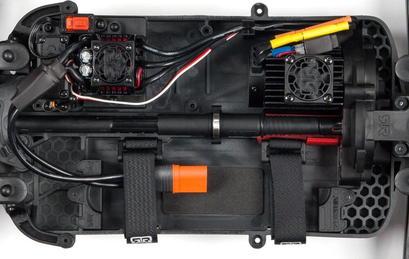 - Two-piece molding screwed to the chassis contains a waterproof receiver box, servo mount, and ESC tray.