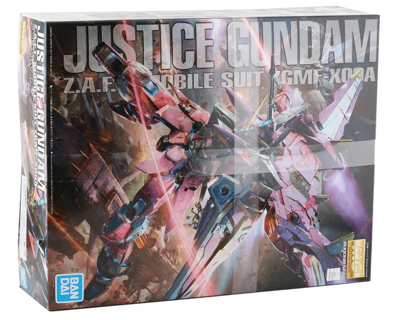 Bandai Justice Gundam “Gundam SEED” MG ZGMF-X09A Model Set. This model features extreme detail and features the beam rifle, shield, dual beam sabers, interchangeable hands for posing options, and a fully-functional Fatum Unit that can be displayed in various positions. Package includes one model kit.