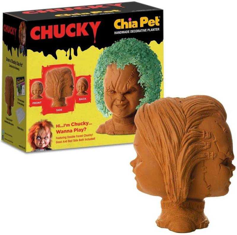 Come play with the new Chucky Chia Pet! This is the first Chia Pet to feature two different faces. Enjoy Chucky Chia Pet’s good side for innocent fun, but look out! On the other side lurks his evil face for your more sinister moods. Chucky Chia Pet is sure to be your friend til the end!