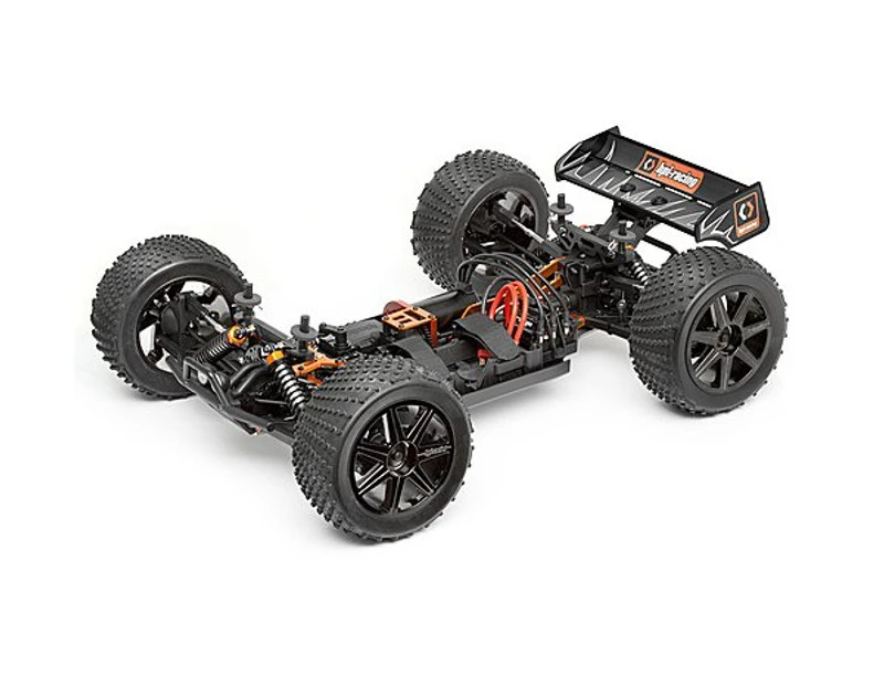 In addition to being race-bred and ready for track action, the Trophy Truggy FLUX looks great, too. The aerodynamic racing truck body features a bright racing design, and the angle-pin racing tires are wrapped around cool black chrome wheels. The rear wing isn’t just for looks, either – it gives the Trophy Truggy FLUX tons of downforce and extra control in the air. To top everything off, the shock caps, wheel nuts and chassis features are anodized a bright HPI orange!