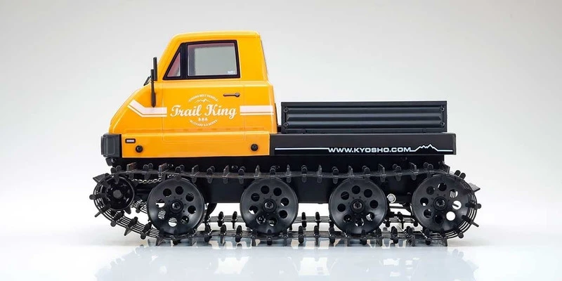 The newest edition to the 1/12 scale electric belt vehicle series further enhances your outdoor experience. Kyosho’s long selling ‘Blizzard’ that has stood the test of time with a legion of loyal fans, has been used as a base for the new ‘Trail King’. Among its many features, a completely new body design creates the retro feel of a hard working machine. In addition to the realistic finish with separate accessory parts, the underbody incorporates a cockpit and always-on front and rear LED lights. A loading platform also provides space for a variety of things to be carried. The Trail King enhances the enjoyment of nostalgic wilderness experiences across a wide variety of scenes with a chassis boasting heavy-duty specifications for smooth and easy travel across any surface including uneven rocky roads and steep gradients. Take control with forward, reverse, left/right and the complete left/right pivot turning capability of a belt vehicle. As the model is fully pre-assembled, the advanced mechanics of the Trail King are ready to be enjoyed straight away. Compatibility with spare and optional parts for the Kyosho ‘Blizzard’ allows you to expand your enjoyment of the snow and sand adventures even further.