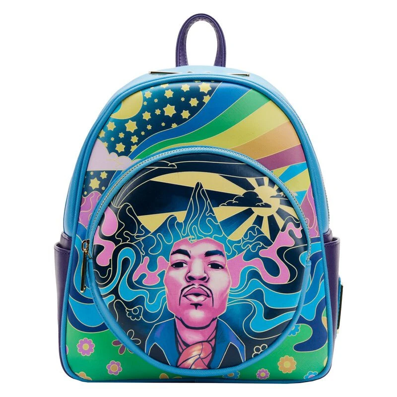 Peace, love, and electric guitar! Capture the sensational sound of Jimi Hendrix’s music with this Loungefly Jimi Hendrix Psychedelic Landscape Glow-in-the-Dark Mini Backpack. You’ll love packing away everything you need to groove through your day in this colorful backpack. Jimi Hendrix’s face rises from grassy fields filled with pops of colorful flowers. A landscape of mountains, wavy rivers, and a brilliant sun blend together on the front zipped pocket. Above, stars and a shining moon watch over. When the lights go out, all the landscape features glow in wavy, groovy lines. On the back, the flowers make another appearance, along with Jimi Hendrix’s signature. It’s the perfect accessory for enjoying an outdoor concert or for bringing harmony to everyday errands.
