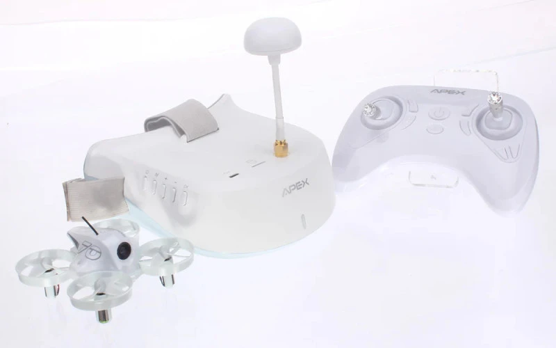 This is a First Person View (FPV) drone set for beginners like to start exploring the world of FPV. The package contains a FPV quad with built-in camera and video transmitter, FPV goggles, a battery and charger. Add a couple of AAA batteries for the radio controller and it is ready to go to enjoy the fun world of FPV.
