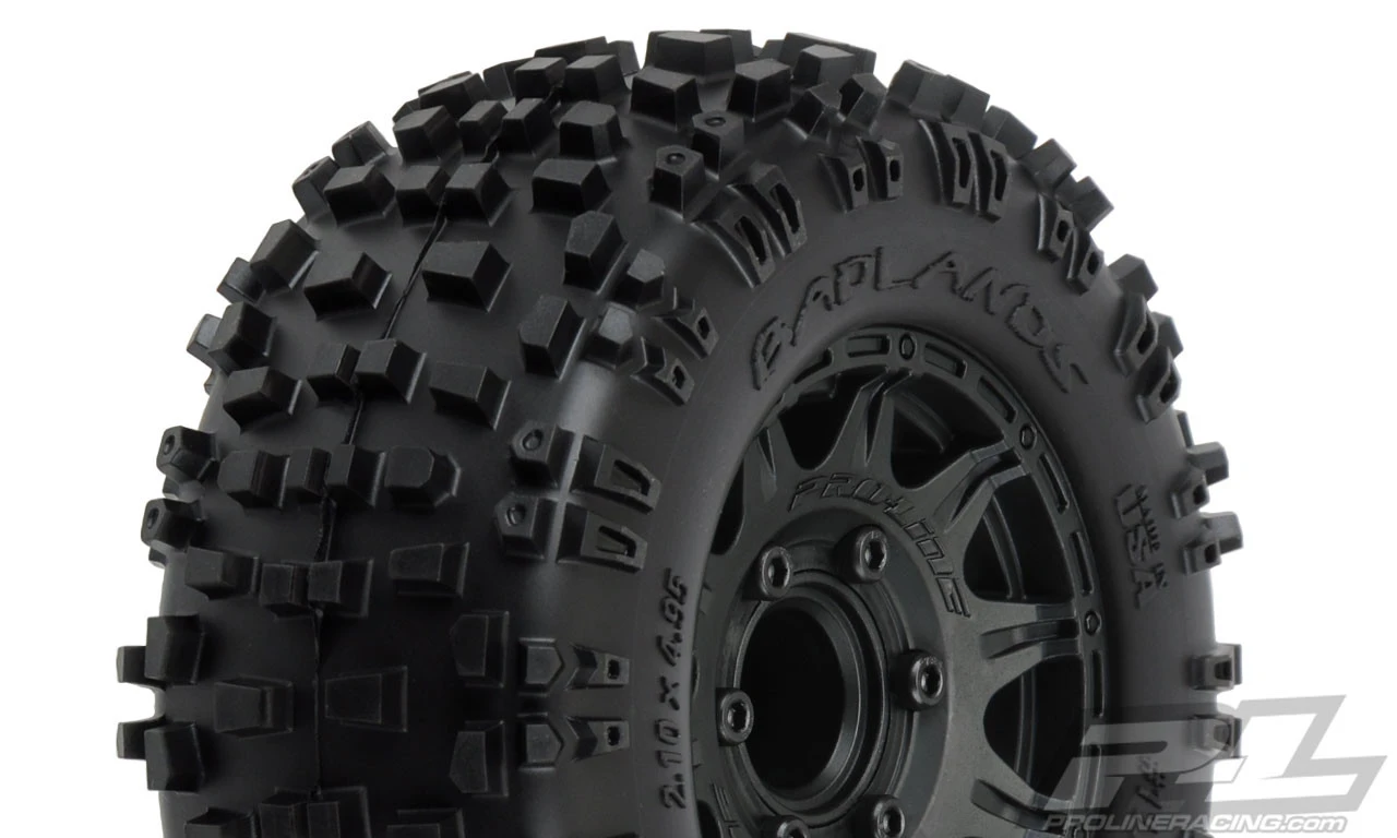 For all you Stampede fans, the wait is over for an aggressive 5″ all-terrain tire! Pro-Line takes the guesswork out of your glue job by doing the mounting for you so you can spend your time having fun! The Badlands tire offers motocross style tread mounted on Raid Removable Hex Wheels. It is made strictly for the MX’er in you. Its oversized lugs offer you the ultimate in grass and dirt shredding performance under all-terrain conditions. The lugs are designed to ensure longevity while digging up the surface below. Made from durable M2 (Medium) compound, the Badlands tire is poised for battle and ready to take your 1:10 truck to the next level.