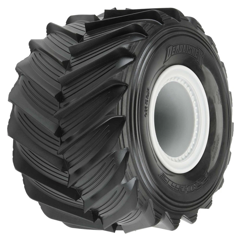 This is a pair of pre-mounted Demolisher Tires for the Losi® LMT. Losi® has unleashed the most exciting solid axle monster truck ever produced with the LMT (Losi® Monster Truck) and Pro-Line already has you covered with high-performance Demolisher tires made specifically for your truck! The Demolisher tires are mounted onto the stock gray LMT wheels and feature extremely sharp tread that will bite into any surface. Just like full-size monster truck tires that have been modified and grooved for maximum performance, the Demolisher tires feature scale grooves in between the chevron style tread for exceptional scale realism. As you should expect from Pro-Line, the Demolisher tire is made from soft and sticky rubber that will give your LMT maximum wheelie-popping traction. Demolish the competition with Pro-Line’s pre-mounted Demolisher LMT tires! Get your own set today!