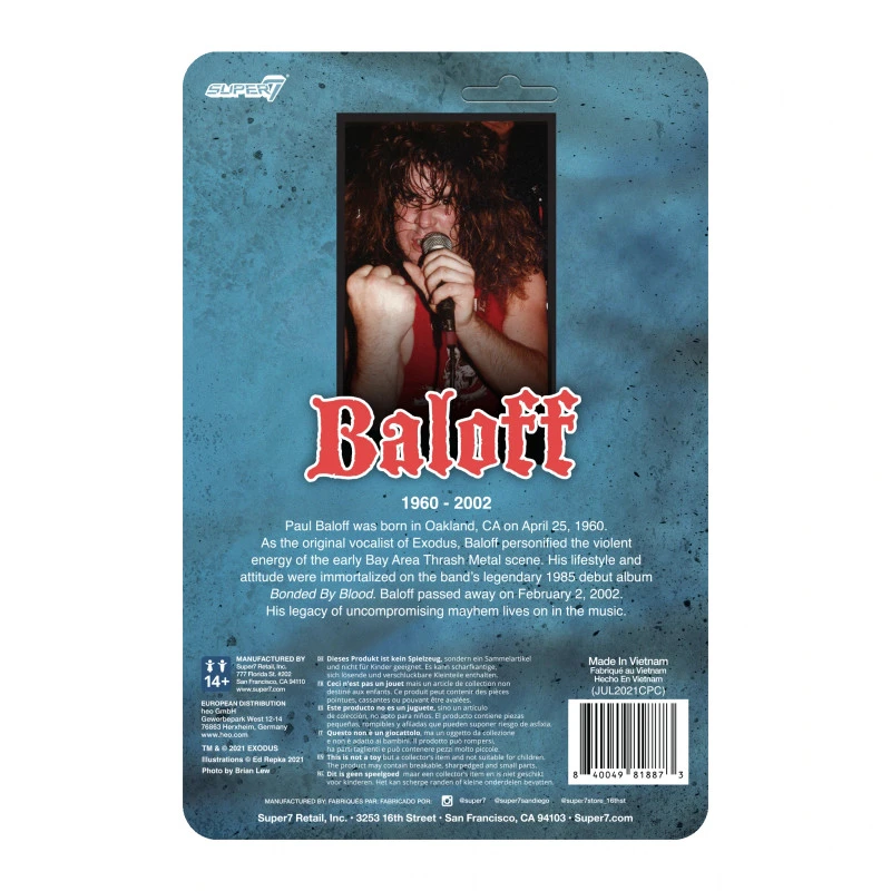 This year marks the 20th Anniversary of Paul Baloff’s death. Baloff personified the violent energy of the early San Francisco Bay Area Thrash Metal scene of the 80s with the band Exodus on their Bonded by Blood album. Baloff’s uncompromising lifestyle and attitude are immortalized with this 3.75” ReAction figure. Comes with a microphone and shattered baseball bat accessories.