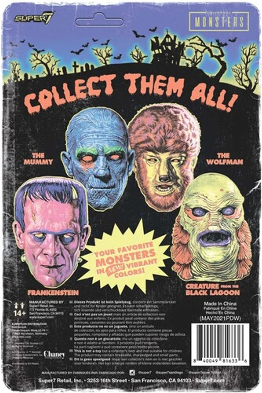 This 3.75” articulated Universal Monsters ReAction figure of The Mummy features a bright color scheme and is packaged on a cardback inspired by wacky off-model color combos seen in vintage Halloween costumes.