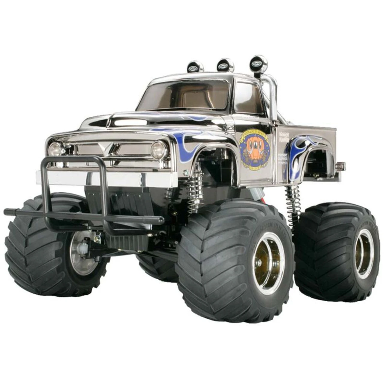 Since its first release, Midnight Pumpkin has been a Tamiya favorite thanks to its classic 1950’s pick-up truck style combined with oversized tires for stomping performance on the track. This updated stylish version of Midnight Pumpkin features all the popular characteristics of the original, combined with a black-metallic body and silver-plated wheels for a more eyecatching appearance. The body, and parts H and J are plated using an advanced vacuum plating technique. Other parts remain the same as original kit, with new packaging used to easily distinguish this limited item from original kit version.